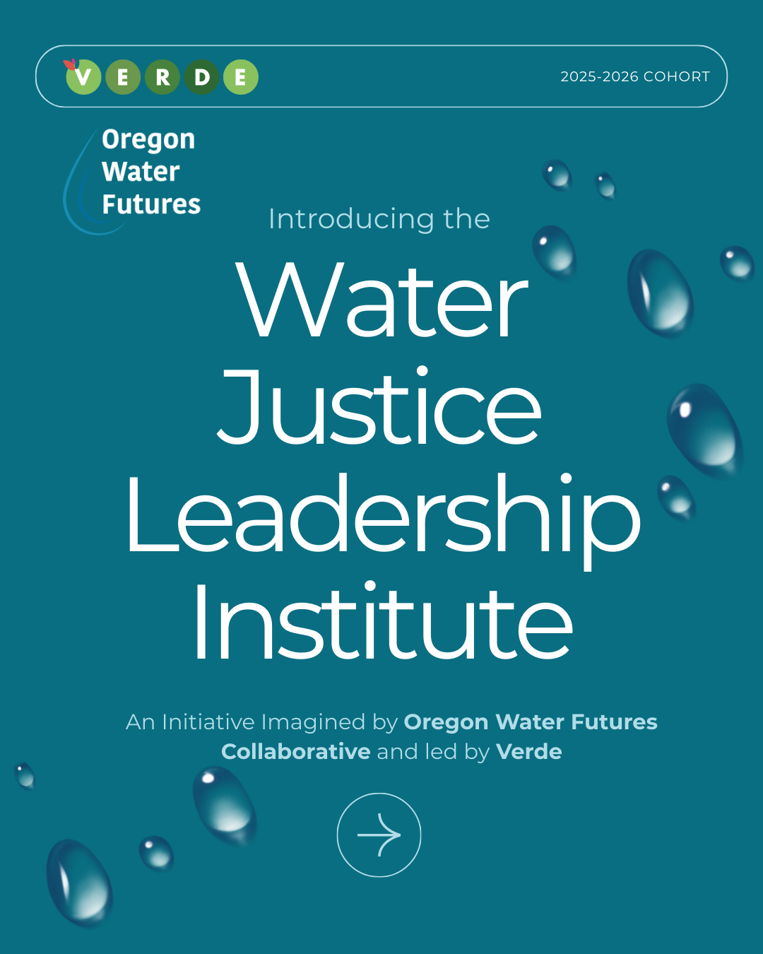 La Colaboración del Futuro del Agua de Oregón utiliza el marco de justicia del agua para impactar cómo se imagina el futuro del agua en Oregon a través de la narración de historias, el desarrollo de capacidades, la creación de relaciones, la formulación de políticas y, abogacía centrada en la comunidad a nivel estatal y local. La colaboración está compuesta por las organizaciones Verde, Coalicion de Comunidades de Color (Coalition of Communities of Color), Consejo Ambiental de Oregon (Oregon Environmental Council), Asociacion de Willamette (Willamette Partnership) y el Instituto de Futuros Justos para Justicia Racial y Ambiental de la Universidad de Oregon Noroeste (Just Futures Institute for Racial and Climate Justice de la Universidad de Oregon PNW).